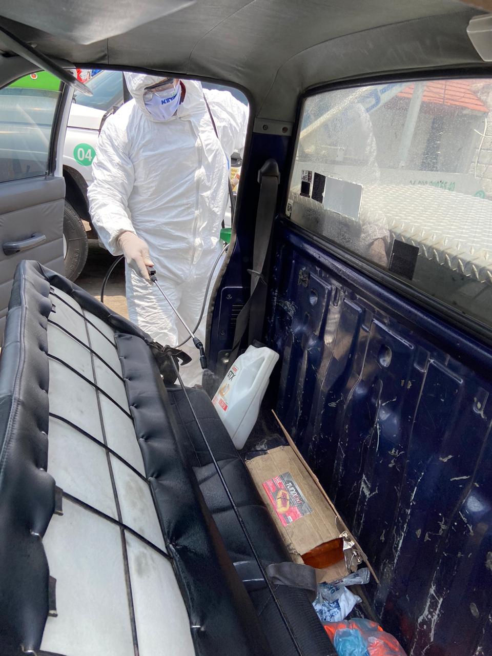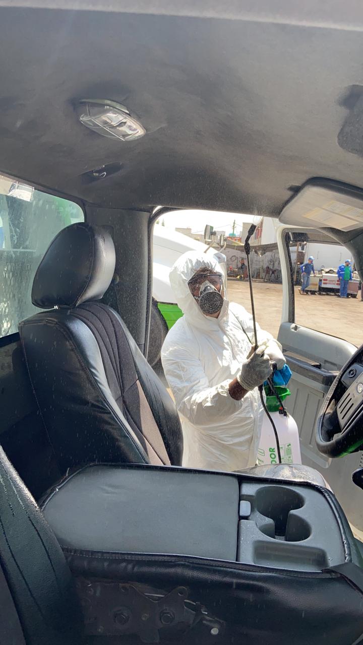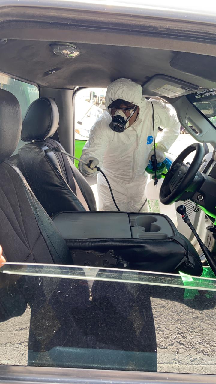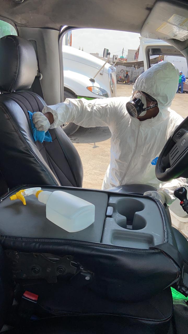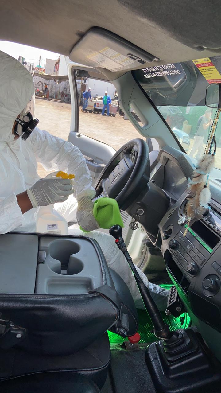 Consiste en desinfectar y/o sanitizar las partes con las que interactúa el usuario: cabina (puertas, tablero, manijas, volante, asientos, palancas, guantera entre otras) a través de un método apegado a la NOM-256-SSA1- 2012.